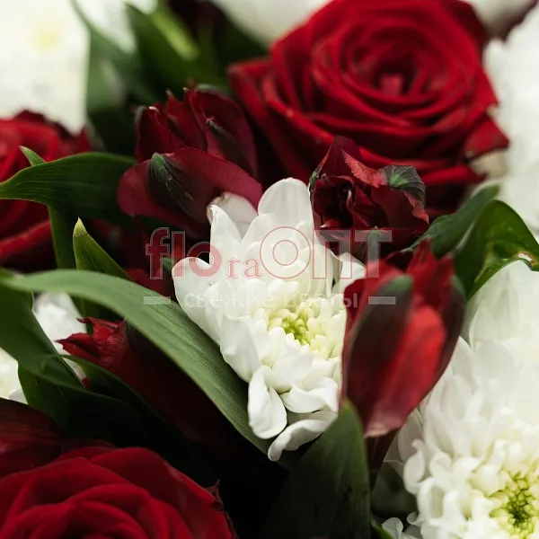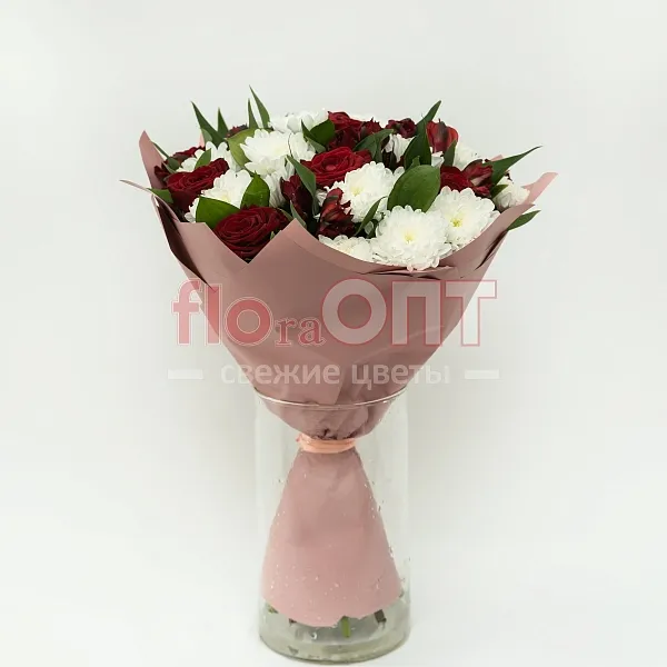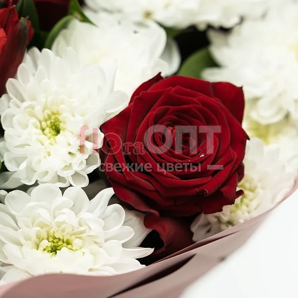 Букет № 515 с белой хризантемой и красными розами
