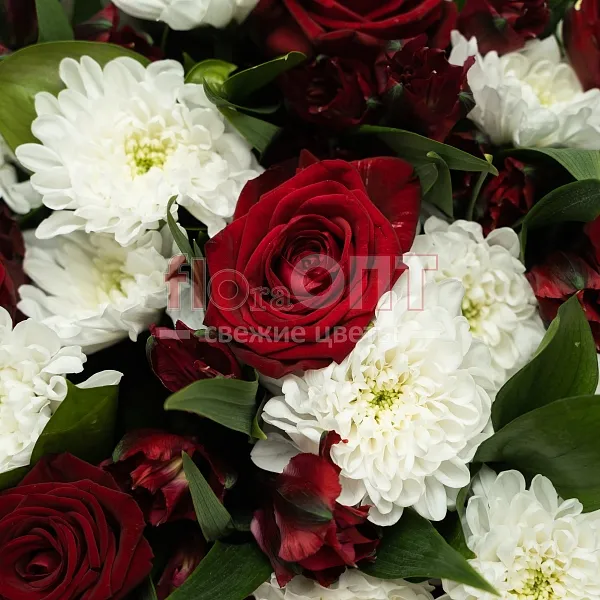 Цветы в составе Альстромерия, Лента пластиковая 30 руб, Пленка 250,руб, Роза Гран При 50 см, Хризантема Кустовая , Расходный материал, ✓ Все цветы в наличии