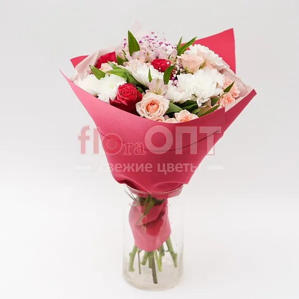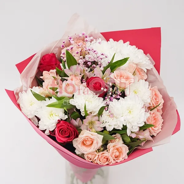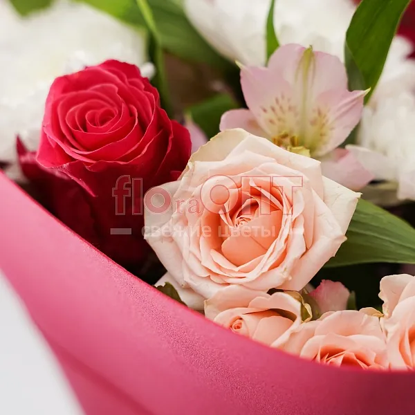 Цветы в составе Альстромерия, Рафия , Роза Китай кустовая 40 см, Гипсофила Крашеная, Роза Россия 50 см, Хризантема Кустовая , Бумага Тишью, Фоамиран, Расходный материал, ✓ Все цветы в наличии