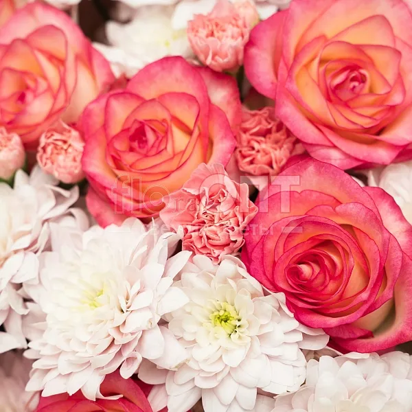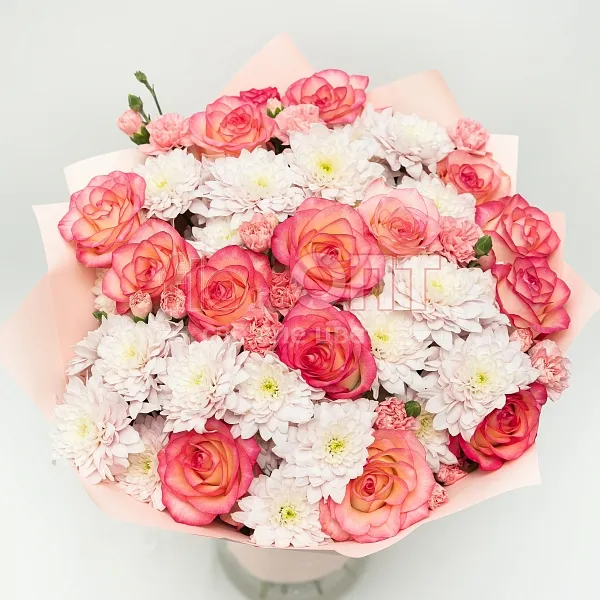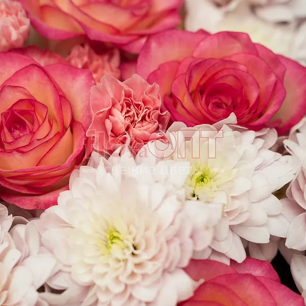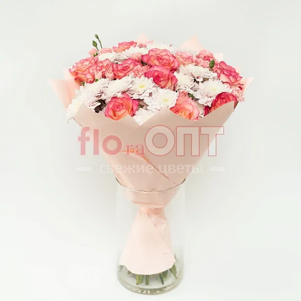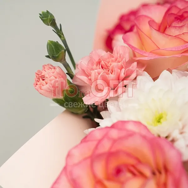 Цветы в составе Гвоздика Кустовая, Лента пластиковая 30 руб, Пленка 250,руб, Роза Россия 50 см, Хризантема Кустовая , Расходный материал, ✓ Все цветы в наличии