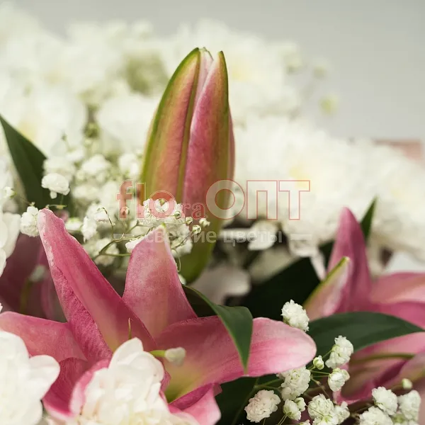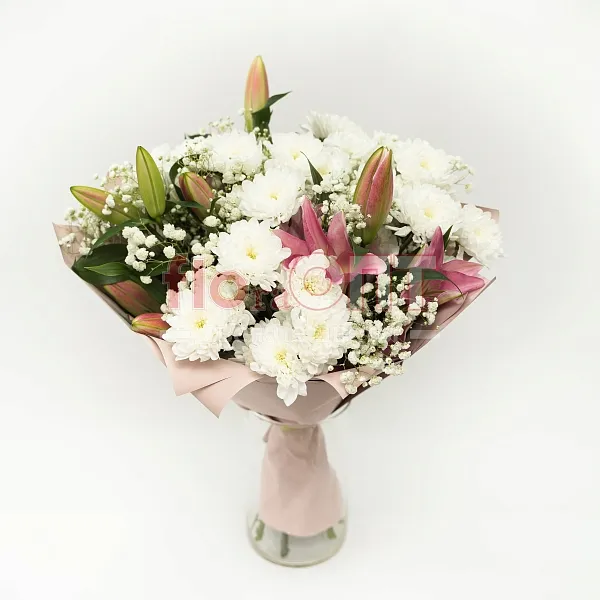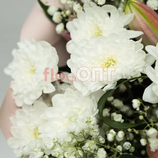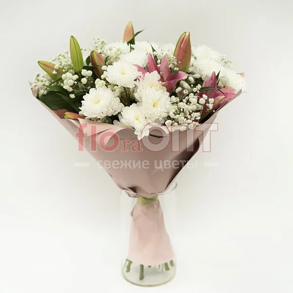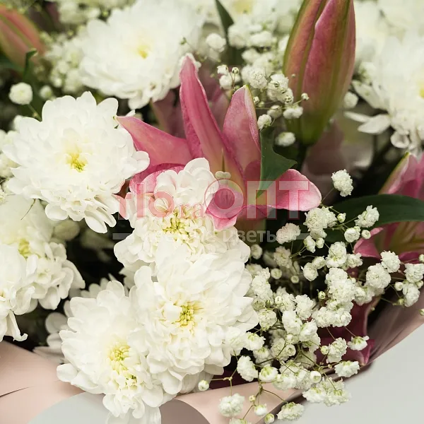Цветы в составе Гипсофила, Лента пластиковая 30 руб, Пленка 250,руб, Лилия, Хризантема Кустовая , Расходный материал, ✓ Все цветы в наличии