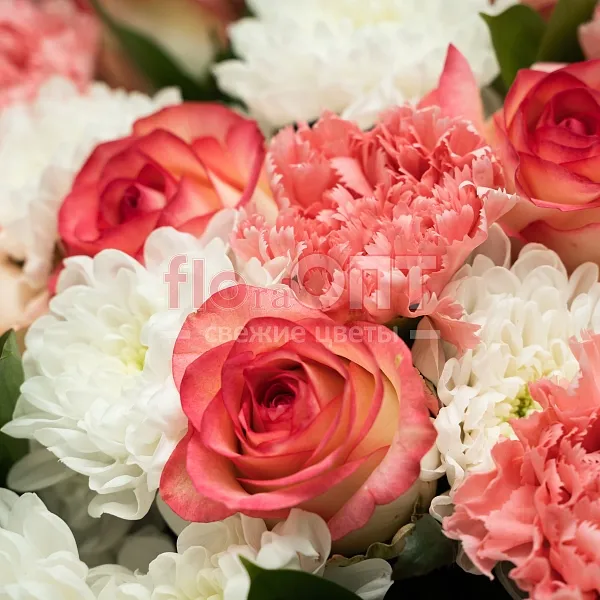 Цветы в составе Гвоздика Одиночная, Лента пластиковая 30 руб, Пленка 250,руб, Рускус Голландия , Роза Россия 50 см, Хризантема Кустовая , Расходный материал, ✓ Все цветы в наличии