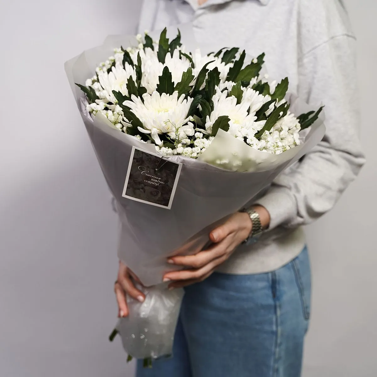 Цветы в составе Гипсофила, Лента текстиль 100 руб, Пленка 170 руб, Хризантема Одиночная Микс, Открытка 50 руб, Бумага Тишью, Расходный материал, ✓ Все цветы в наличии