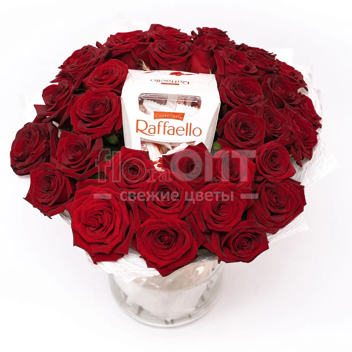 Букет № 444 с красными розами и конфетами Raffaello