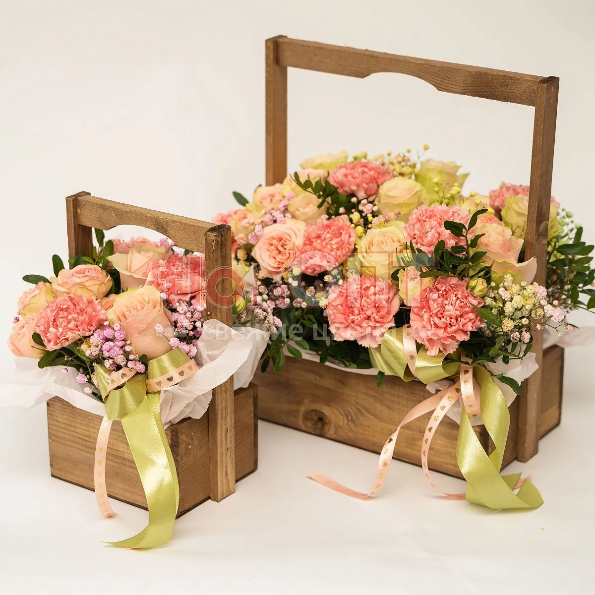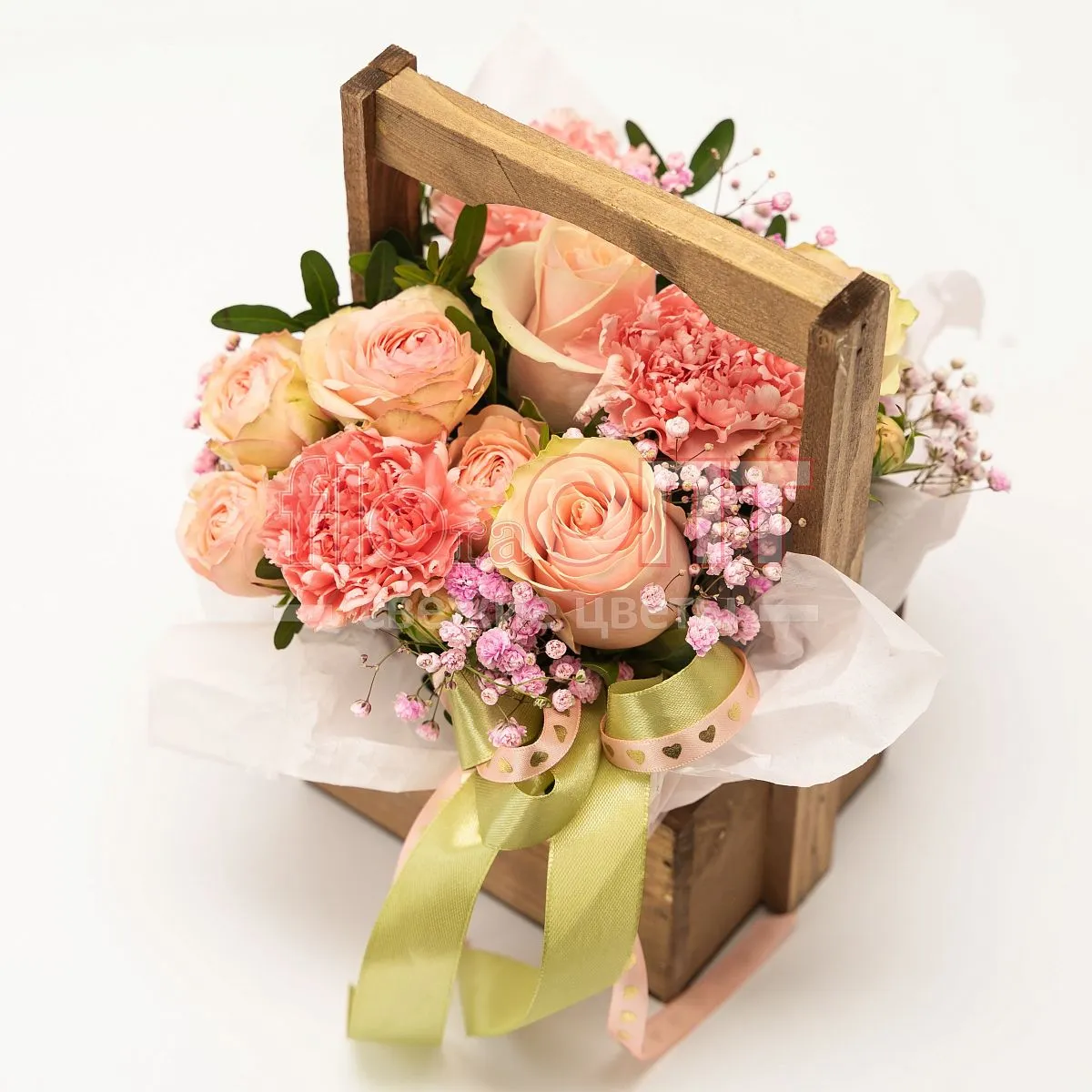 Цветы в составе Гвоздика Одиночная, Лента текстиль 60 руб, Оазис , Роза Россия Кустовая 50 см, Роза Микс 40 см, Фисташка, Кашпо 450 руб, Гипсофила Крашеная, Бумага Тишью, ✓ Все цветы в наличии