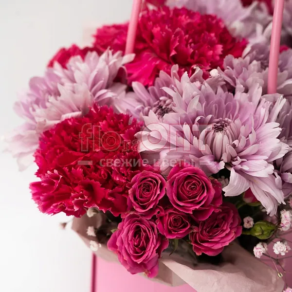 Цветы в составе Гвоздика Одиночная, Лента текстиль 80 руб, Оазис , Роза Китай кустовая 50 см, Декор 350 руб, Гипсофила Крашеная, Хризантема Кустовая , Бумага Тишью, Расходный материал, ✓ Все цветы в наличии