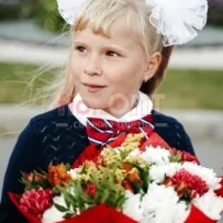 «Первый раз — в первый класс! Понесли учителю шикарный букет.»
