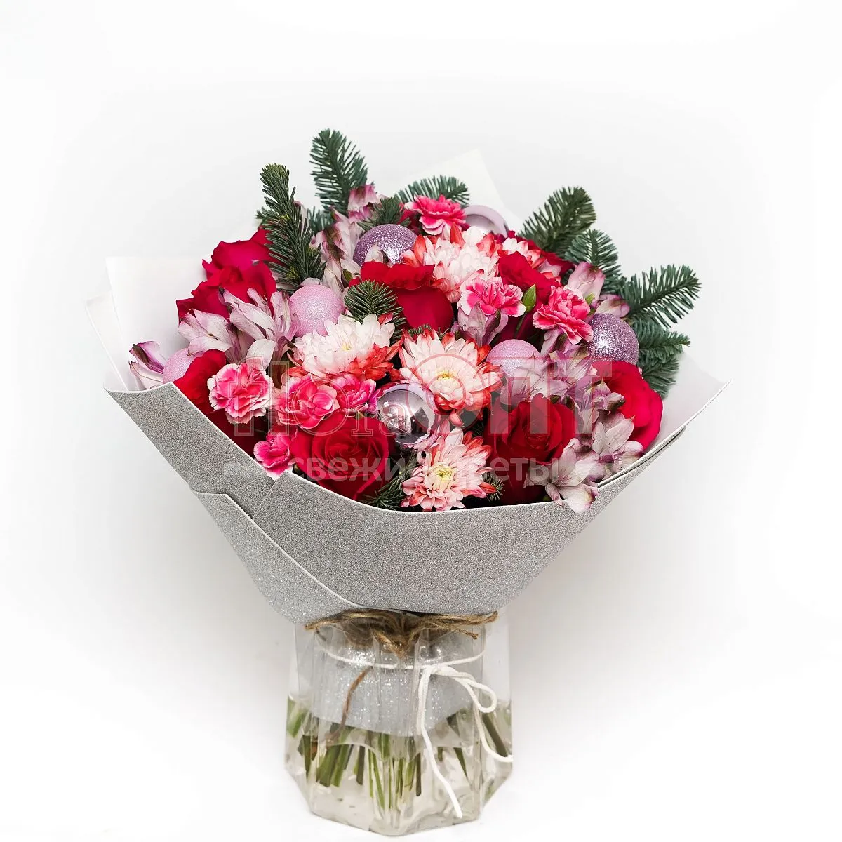 Цветы в составе Альстромерия, Гвоздика Кустовая, Лапка Ели , Рафия , Декор 100 руб, Хризантема Кустовая Крашенная, Роза Микс 50 см, Фоамиран, ✓ Все цветы в наличии