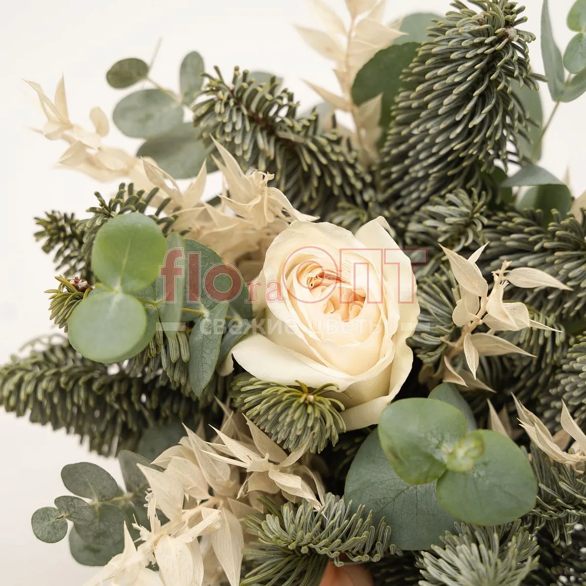 Цветы в составе Лапка Ели , Лента текстиль 80 руб, Оазис , Эвкалипт Де Люкс, Декор 200 руб, Декор 800 руб, Роза Микс 50 см, Расходный материал, ✓ Все цветы в наличии