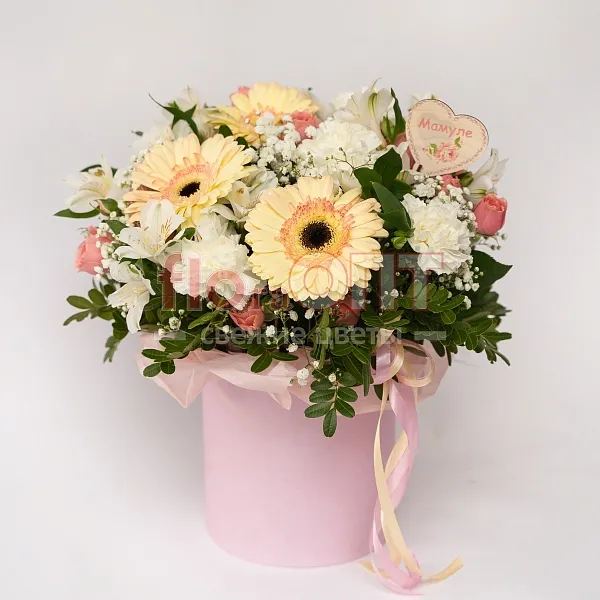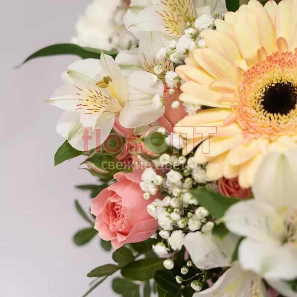 Возможна незначительная замена элементов композиции. Если какого-то цветка или оттенка, как на фотографии, не окажется в салонах, то флорист предложит вам варианты и пришлёт фото на выбор в WhasApp.