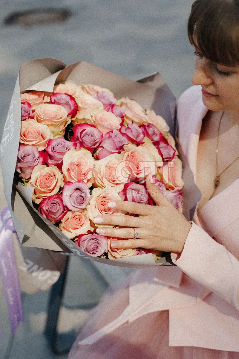 Возможна незначительная замена элементов композиции. Если какого-то цветка или оттенка, как на фотографии, не окажется в салонах, то флорист предложит вам варианты и пришлёт фото на выбор в WhasApp.